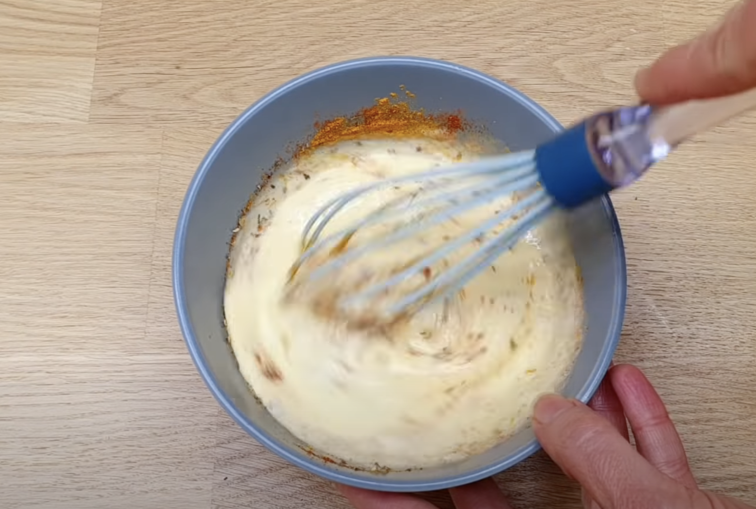 Wymieszaj śmietanę z wyciśniętym czosnkiem, musztardą i przyprawą gyros. Wlej to do naczynia z pokrojonym mięsem. Jeśli nie masz w domu przyprawy gyros, możesz ją zastąpić mieszanką ziół i czerwoną papryką.