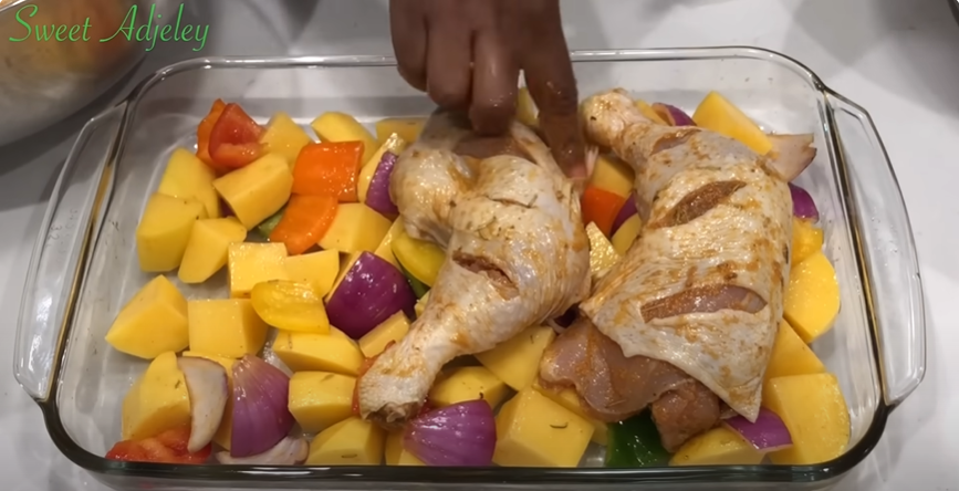 Na blachę do pieczenia wyłóż warzywa, a na wierzchu ułóż udka z kurczaka. Piecz w piekarniku rozgrzanym do 190°C przez około 50 minut. Przez pierwsze 30 minut piecz pod folią aluminiową, aby mięso pozostało soczyste, a następnie zdejmij folię, aby udka ładnie się zarumieniły.