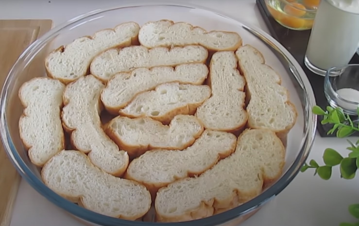 Pierwszym etapem jest pokrojenie chleba na mniejsze kawałki w tzw. koronkę, o grubości wynoszącej około 2 cm, a następnie przygotowane części chleba należy ułożyć na dnie naczynia żaroodpornego.