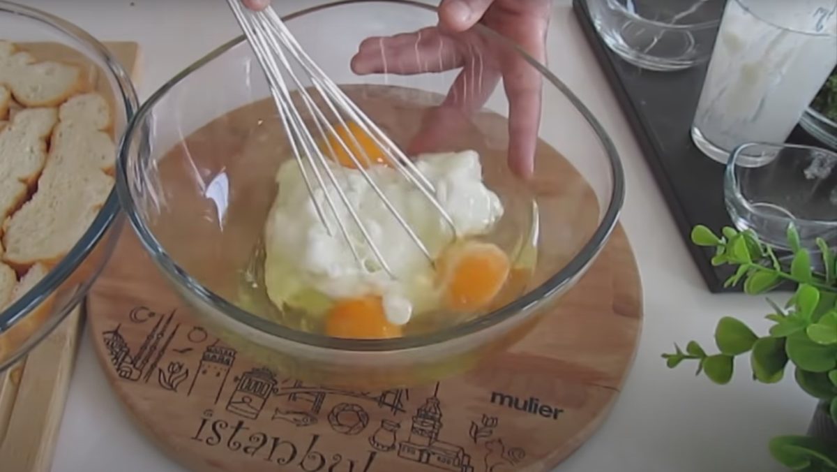 Kolejnym krokiem jest ubicie jajek w oddzielnej misce, po czym dodanie do nich jogurtu, soli oraz oleju i wymieszanie wszystkich składników ze sobą z użyciem trzepaczki.