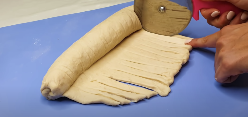 Przy użyciu noża przetnij końce ciasta, tworząc równe paski, a następnie ułóż je na szczycie ciasta.