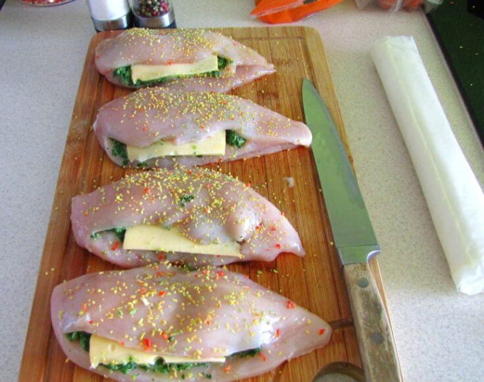 Napełniamy ją przygotowanym farszem szpinakowo-śmietanowym. Na farsz nakładamy ser żółty i zamykamy „kieszonkę”. Pierś możemy posypać delikatnie solą i wedle upodobań – przyprawą do kurczaka.
