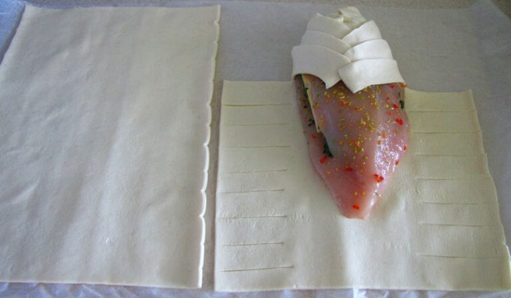 Długość pasków jest zależna od wielkości mięsa, ponieważ pierś z kurczaka musi leżeć na nierozciętej części ciasta. Analogicznie kładziemy pierś na cieście i zawijamy, delikatnie po skosie, by żadna część mięsa nie wystawała spod ciasta.