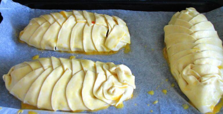 Następnie każdy płat ciasta francuskiego musimy podzielić na dwie części. Z każdej strony nacinamy paski o grubości około 2 cm. Nie rozcinamy całego ciasta.