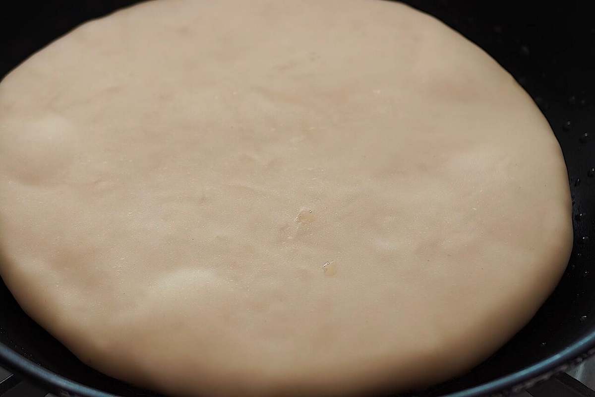 Następnie, placek należy smażyć, aż do uzyskania złotego koloru, po obu stronach na wysmarowanej tłuszczem patelni.