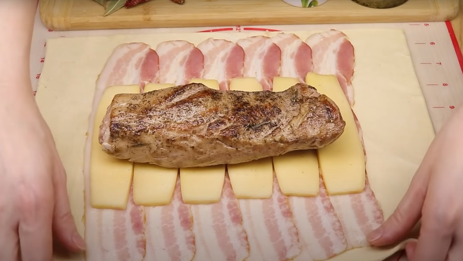 Blat roboczy posyp mąką i rozwałkuj na nim ciasto francuskie. Kolejno rozłóż na nim plastry boczku i plasterki sera oraz polędwicę. Zawiń w roladę, dociśnij krawędzie.