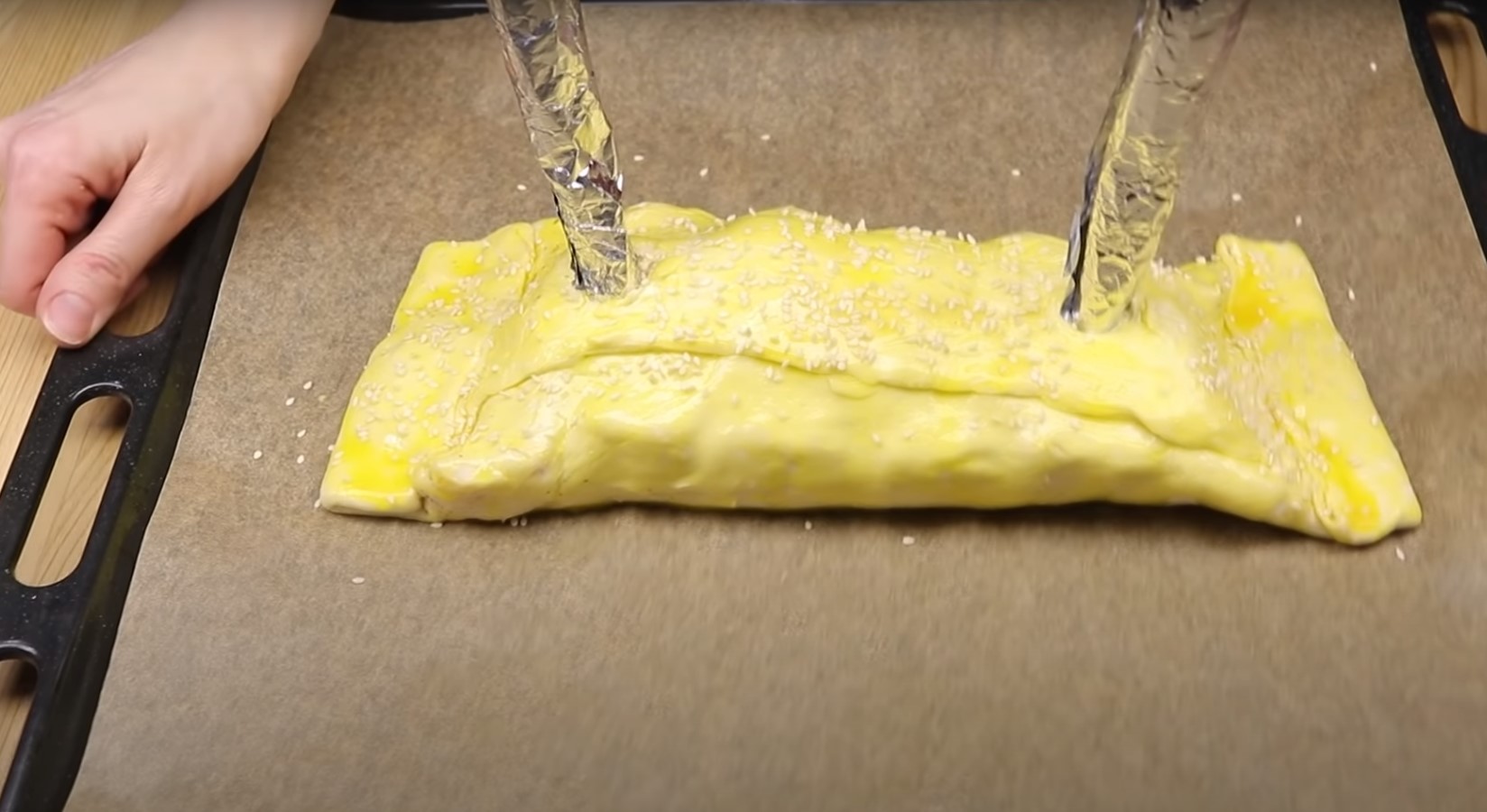 Blachę przykryj papierem do pieczenia i ułóż na niej zawinięte w ciasto mięso, posmaruj wierzch roztrzepanym żółtkiem i posyp sezamem.