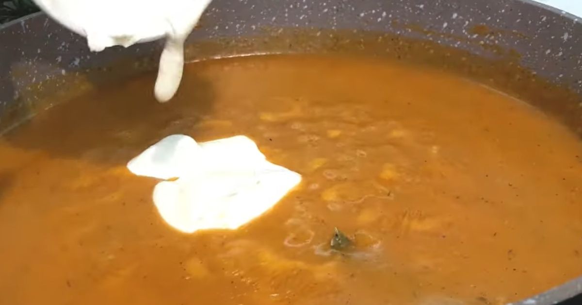 Cały czas mieszaj mieszankę w rondlu. Dodaj przyprawy według własnego smaku. Wymieszaj wszystko razem, a następnie dodaj śmietanę. Uważaj, aby nie powstały grudki. Gotowe.