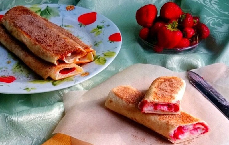 Do twarogu dodaj trochę ulubionych owoców (np. truskawki) lub dżem. Tortillę smaż na suchej patelni z obydwu stron, aby były chrupiące.