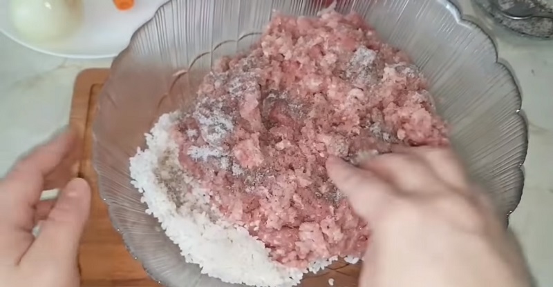 W celu przygotowania nadzienia do gołąbków bierzemy surowy ryż i opłukujemy go dokładnie wrzącą wodą. Ryż możemy także ugotować wcześniej na półtwardo. Do ryżu dodajemy mięso mielone, sól i pieprz. Wszystko dokładnie mieszamy dłonią.