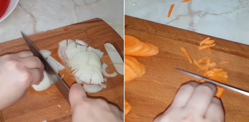 Cebule i marchewki obieramy i siekamy. Następnie smażymy je na patelni na oleju roślinnym. Długość smażenia warzyw powinna wynosić około 5-7 minut.