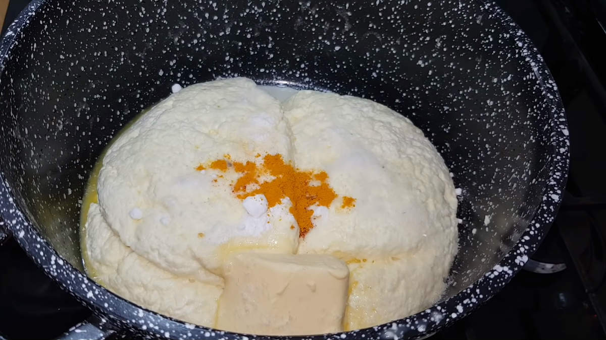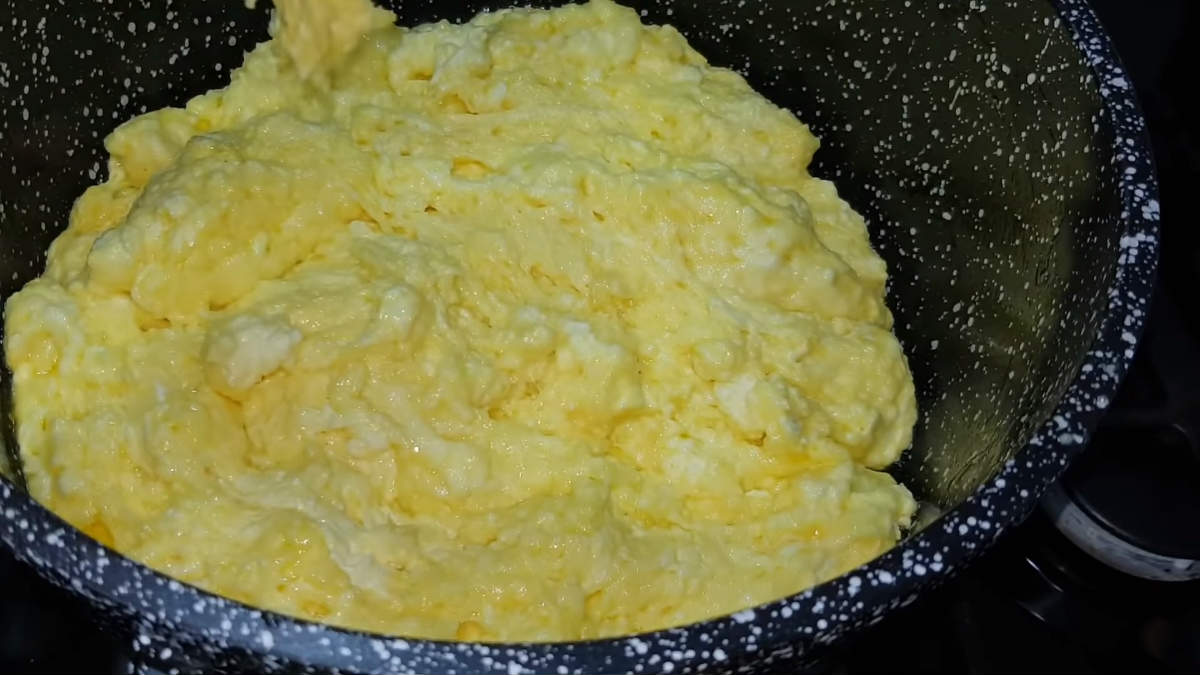 Przenieś twaróg do durszlaka, aby pozbyć się z niego płynu. Odciśnij ser z nadmiaru serwatki i dodaj do niego masło, sodę oczyszczoną, sól oraz kurkumę. Następnie wymieszaj wszystko dokładnie i przełóż do garnka. Gotuj twaróg na średnim ogniu nie przestając mieszać. Kiedy masa będzie już jednolita to dodaj warzywa, ale bez ziół. Gotuj jeszcze przez około 3 minuty, cały czas mieszając.