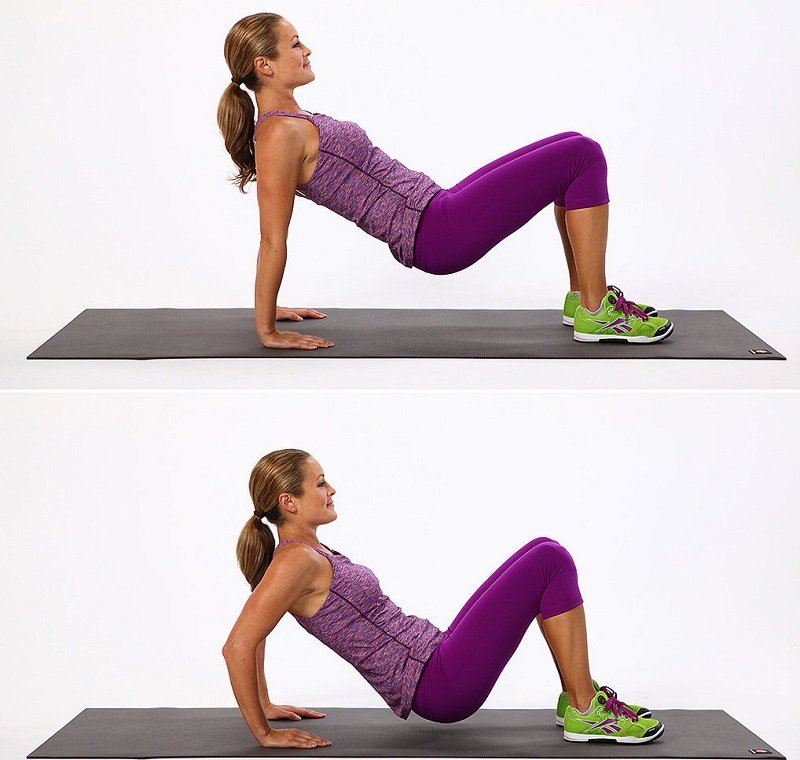 Usiądź na podłożu. Ustaw ręce mniej więcej 15 cm za sobą, z dłońmi rozstawionymi na szerokość ramion, skierowanymi w stronę pleców. Nogi zegnij w kolanach. Opierając się na rękach oraz na nogach, podnieś biodra w górę i wytrzymaj kilka sekund.
