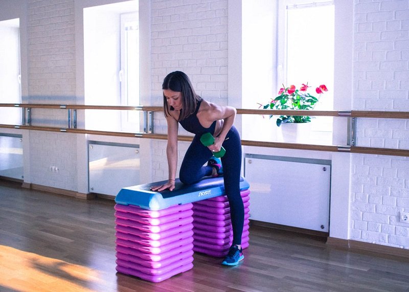 Do tego ćwiczenia możesz użyć hantli od 0,5 kg do 2 kg, ale jeśli takich nie posiadasz, to nic nie szkodzi, ponieważ możesz także użyć butelki z wodą. Usiądź na krzesełku. Wyprostuj plecy, delikatnie pochyl się do przodu. Jedną ręką podeprzyj się na krześle, a w drugiej trzymaj hantle lub butelkę.