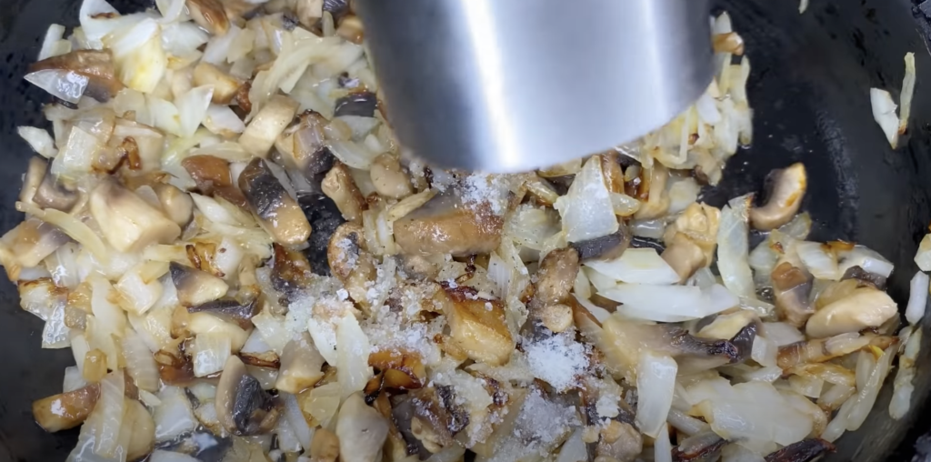 Posiekaną cebulę podsmażyć na patelni. Dodaj startą marchewkę, pokrojone w plasterki pieczarki. Wszystko pieczemy w domu.