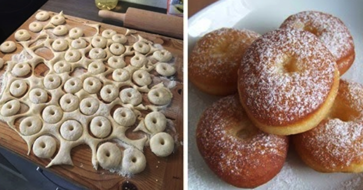 Za pomocą szklanki wytnij z ciasta kółka, a w ich środku wytnij kolejne małe np. za pomocą kieliszka. Na patelnię wlej odpowiednią ilość oleju i smaż ciastka z obu stron, aż uzyskają piękny, złoty kolor. Gotowe wyjmij na serwetkę lub ręcznik papierowy aby pozbyć się nadmiaru oleju. Przed podaniem posyp cukrem pudrem.