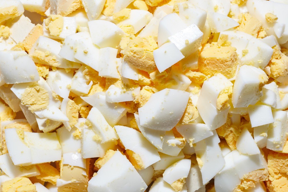 Najpierw przygotuj sos: wymieszaj majonez, musztardę i posiekany koperek. Dodaj sól i pieprz do smaku. Ugotowane jajka pokrój w dużą kostkę.