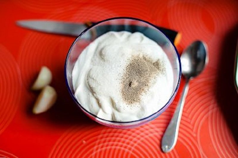Czosnek przeciskamy przez praskę, łączymy go z jogurtem i majonezem i dokładnie mieszamy całość.