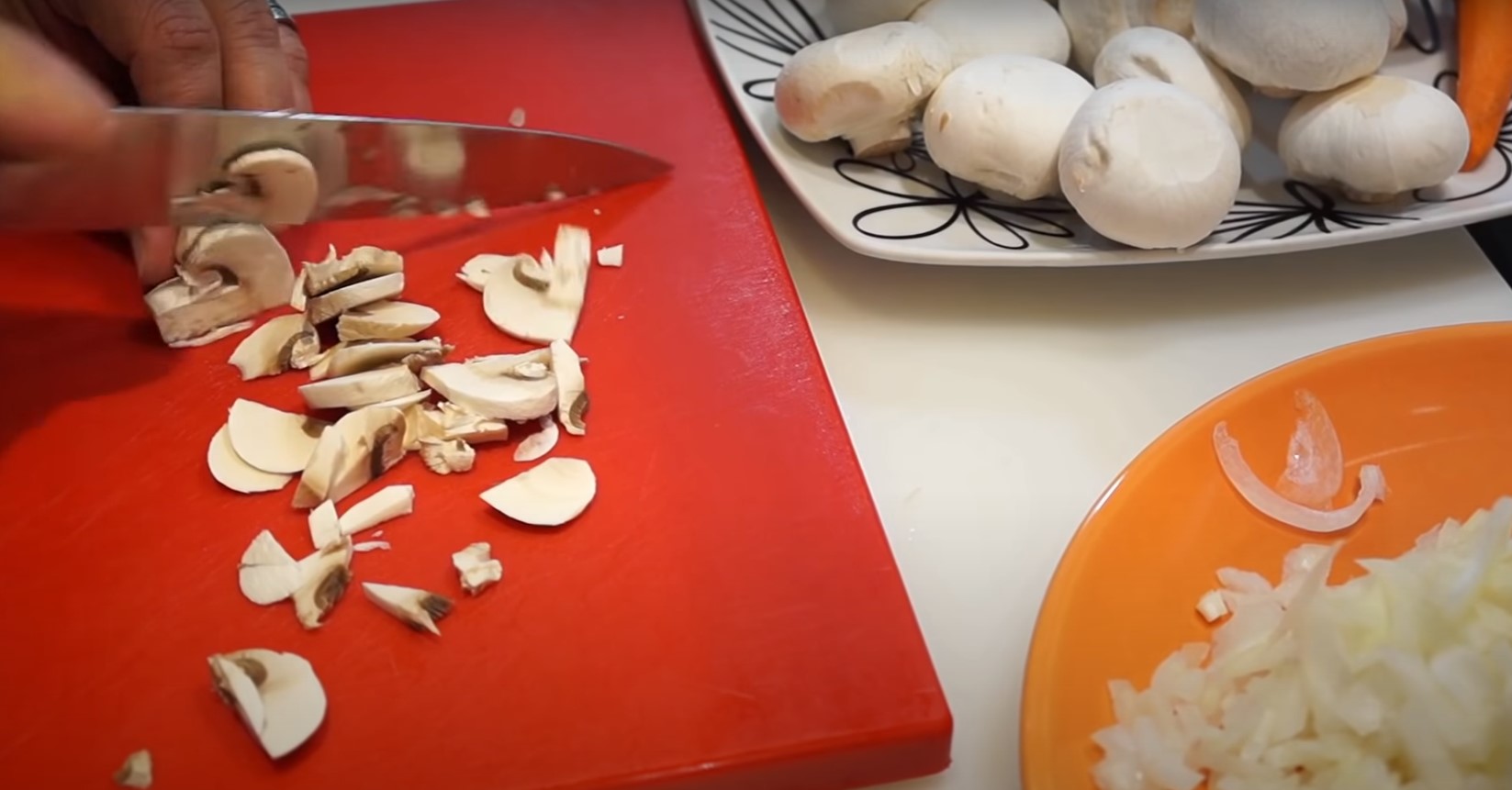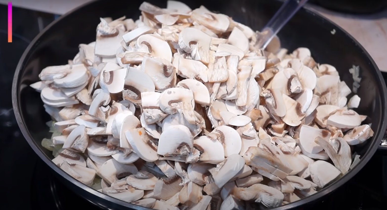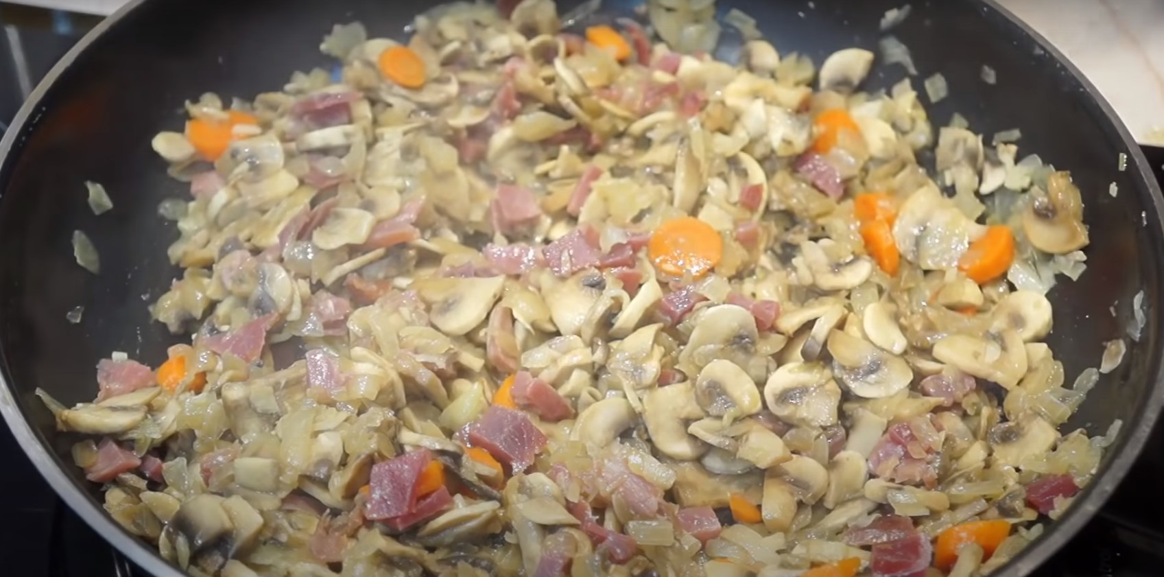 Przygotuj farsz: podsmaż pokrojone warzywa – czosnek, cebulę, pieczarki,  oraz marchew.