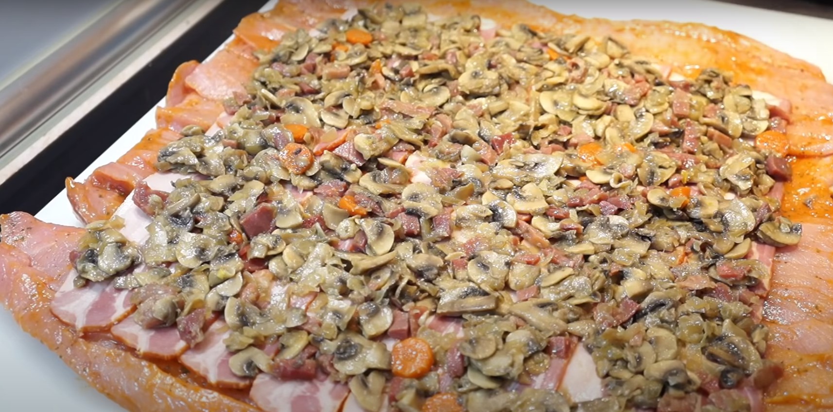 Na schabie rozłóż plastry boczku i na to nałóż przygotowany farsz.