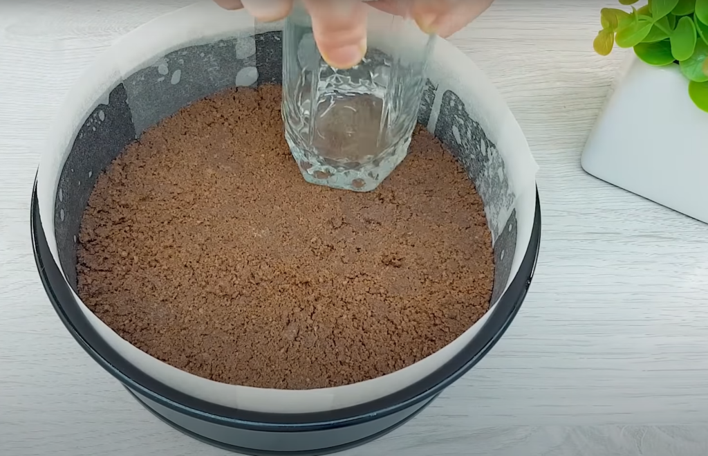 Zmiel herbatniki, przełóż do miski i zalej roztopionym masłem. Wymieszaj łyżkę bitej śmietany i powstałe ciasto biszkoptowe wyciśnij na dno tortownicy, którą wyłożyliśmy papierem do pieczenia. WSKAZÓWKA: Możesz użyć np. szklanki, aby wcisnąć ciasto do formy.