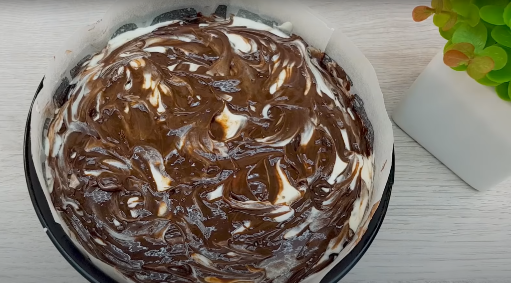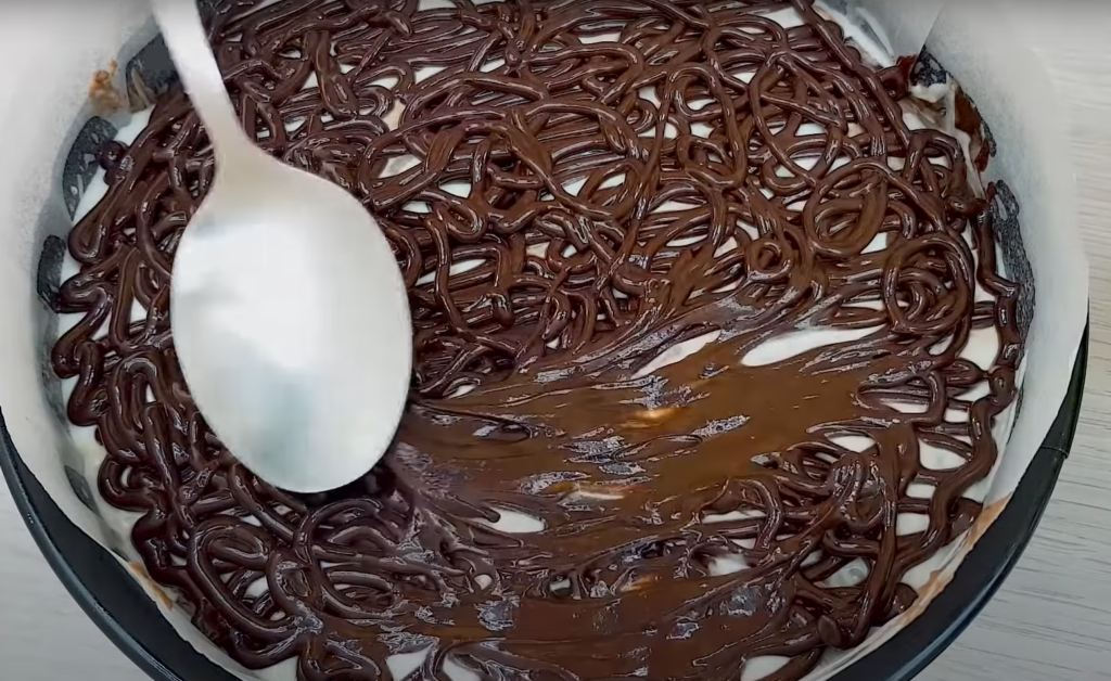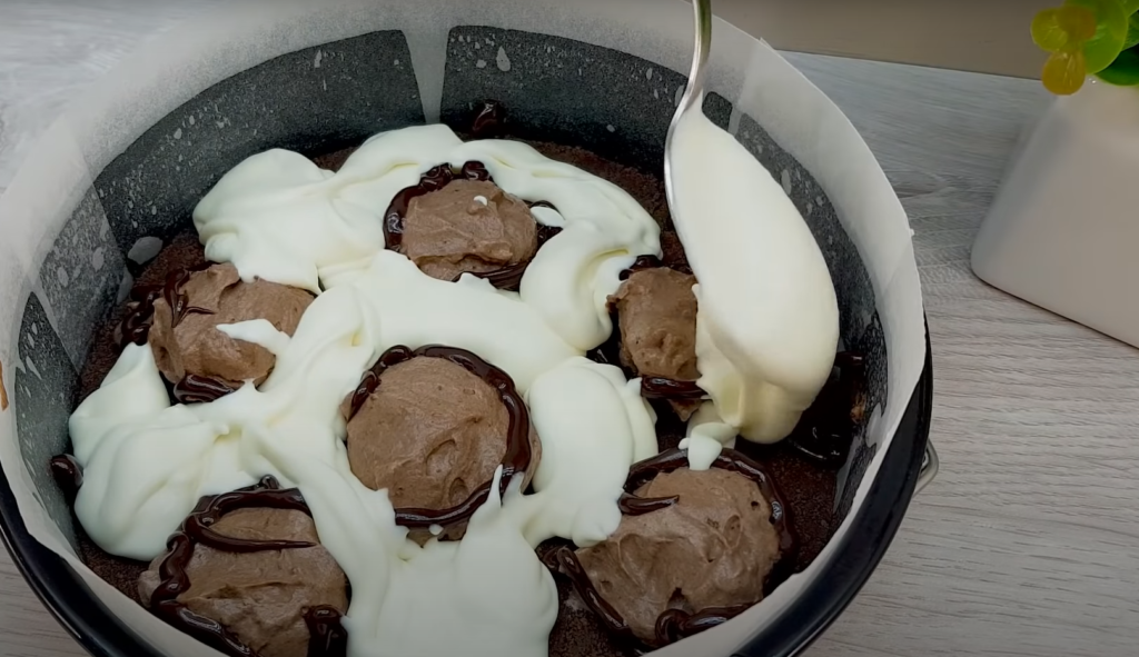 Przygotować lukier, polewając połamaną czekoladę gorącą bitą śmietaną i mieszać trzepaczką do uzyskania gładkości. Z lodówki wyciągamy formę z ciastem. Nakładamy stosy kremu kakaowego, które łączymy z polewą czekoladową, a resztę wypełniamy białym kremem.