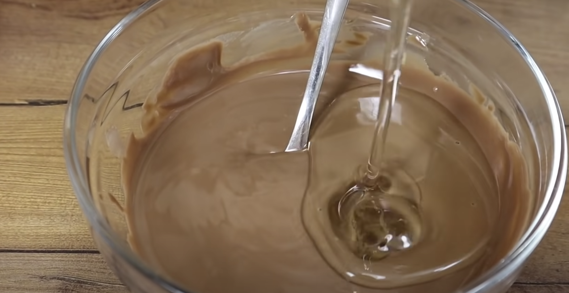 Następnie do rozpuszczonej masy dodajemy olej i dokładnie mieszamy do uzyskania jednolitej konsystencji.