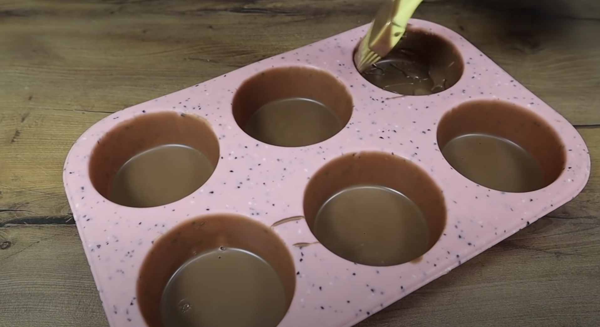 Następnie szykujemy formę do muffinek. Najlepiej sprawdzi się sylikonowa. Uzyskaną masą smarujemy, za pomocą pędzelka otwory w formie i wstawiamy ją do zamrażalnika na około 10 minut.