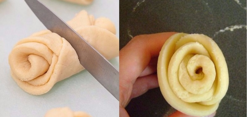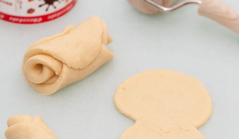 Rozwałkuj ciasto na grubość około 2-3 milimetrów. Następnie wytnij kółka np. za pomocą szklanki. 3-4 kółka ułóż nierówno na sobie. Następnie zwiń je w małą rolkę.