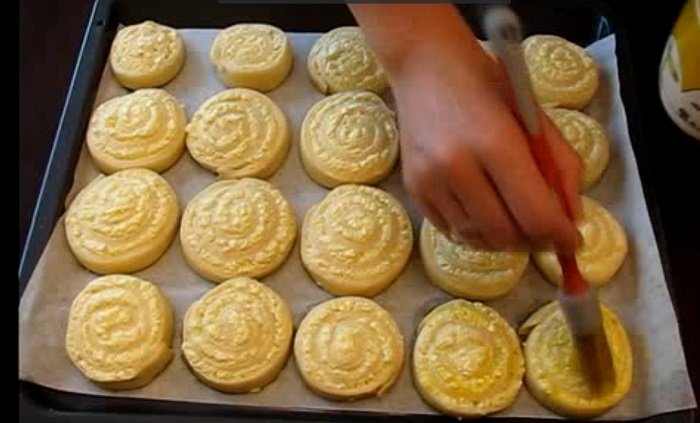 Weź dużą blaszkę i rozłóż na niej papier do pieczenia. Ułóż równo „ślimaczki” na blaszce, przykryj je ściereczką i odstaw na około 40 minut, żeby trochę wyrosły. Po tym czasie posmaruj ciastka roztrzepanym jajkiem i wstaw je do piekarnika rozgrzanego do 180 stopni.