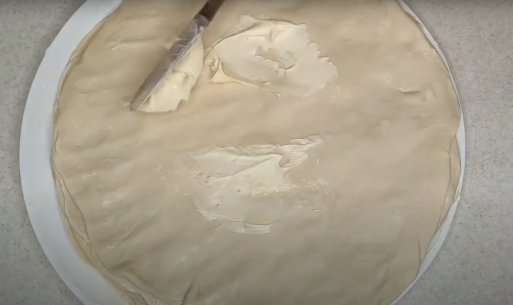 Teraz wałkujemy kulkę ciasta pojedynczo w cienki naleśnik, który następnie posmarujemy zmiękczonym masłem. Nakładamy kolejną warstwę na każdy posmarowany masłem naleśnik.