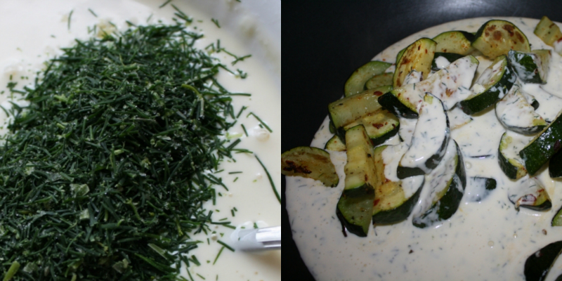 Blachę po pieczeni wyłóż pergaminem. Na blachę wyłóż cukinii, piec przez 15 minut w temperaturze 200 stopni. Koperek drobno posiekaj i dodaj do śmietany oraz dołóż przeciśnięty przez praskę czosnek. Następnie dodaj jajko, mąkę i zalej wszystko wodą. Upieczoną cukinie przełóż na patelnię, zalej sosem śmietanowym.