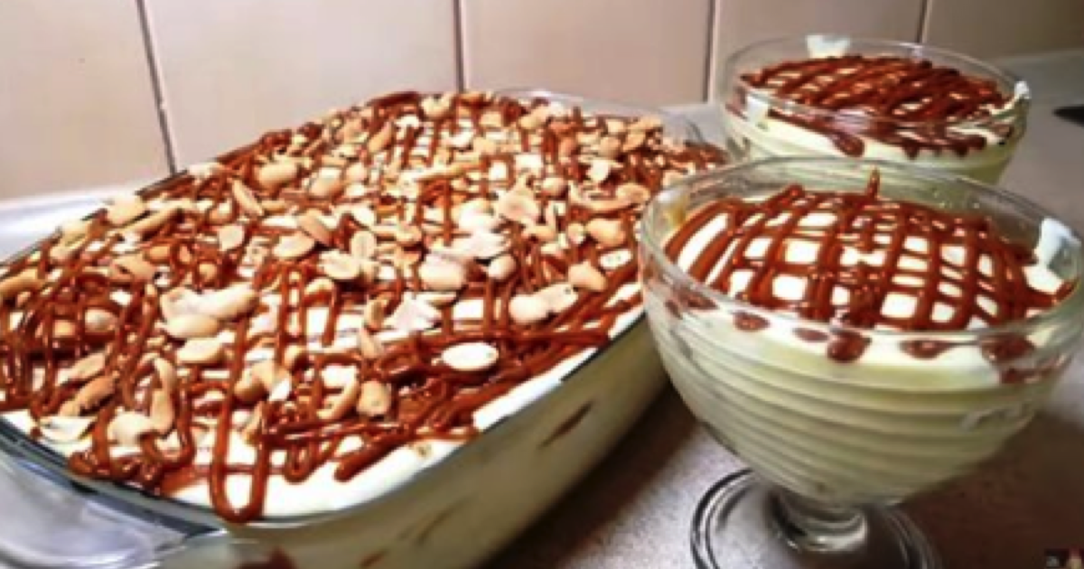 Przykryj górną warstwę ciastek kremem i posyp solonymi orzeszkami ziemnymi, udekoruj siatką ze skondensowanego mleka, ponownie posyp orzechami i włóż ciasto do lodówki na noc. Smacznego!