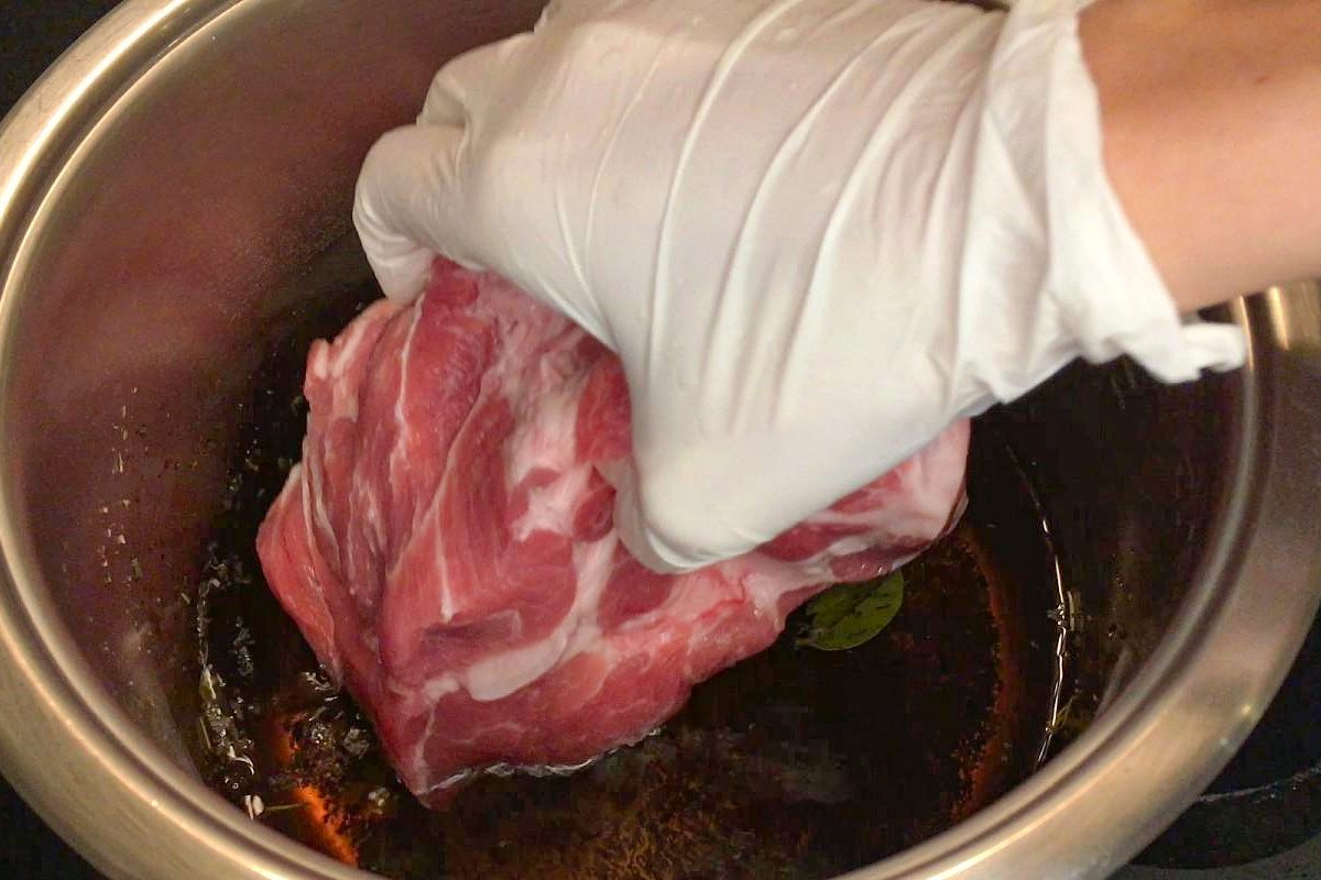 W rzeczywistości każda porcja wieprzowiny z umiarkowaną ilością tłuszczu jest w porządku. Mięso nie powinno być chude, to znaczy lepiej nie brać polędwicy. Zamiast tego lepiej jest dać pierwszeństwo szynce (wersja tradycyjna) lub karkówce. Tłuszcz stopi się podczas długiego pieczenia i nasyci mięso.