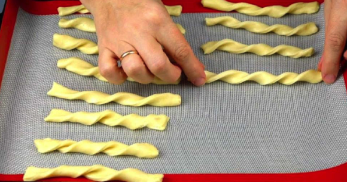 Pokrój na cienie paski i skręć wokół własnej osi. Ułóż na blaszce wyłożonej papierem do pieczenia. Tak samo postąp z drugą połową ciasta.