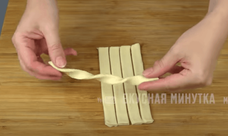 Pokrój na cienie paski i skręć wokół własnej osi. Ułóż na blaszce wyłożonej papierem do pieczenia. Tak samo postąp z drugą połową ciasta.