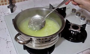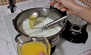Mleko wlewamy do garnka i doprowadzamy do wrzenia na kuchence. Jeśli używasz świeżego mleka, gotuj przez kilka minut. Nie jest to już konieczne w przypadku pasteryzacji. Po zagotowaniu dodać cztery łyżki soku z cytryny do mleka i gotować dalej, od czasu do czasu mieszając, aż płyn w garnku zacznie się zwijać i oddzielać ciało stałe od płynu.
