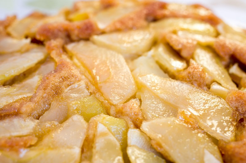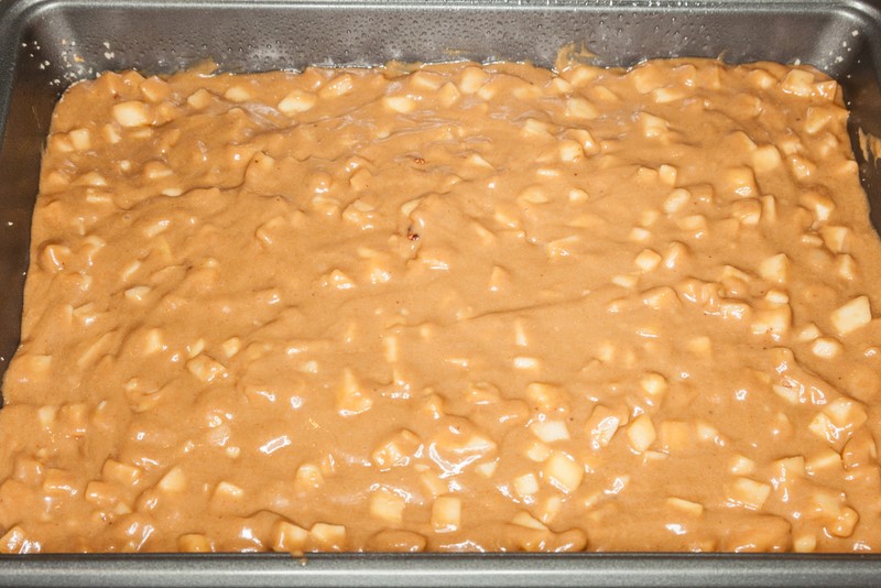 Blachę do pieczenia wyłóż papierem oraz wysmaruj masłem. Następnym krokiem jest ułożenie jabłek na przygotowaną blaszkę. Następnie wlej na nie przygotowane ciasto.