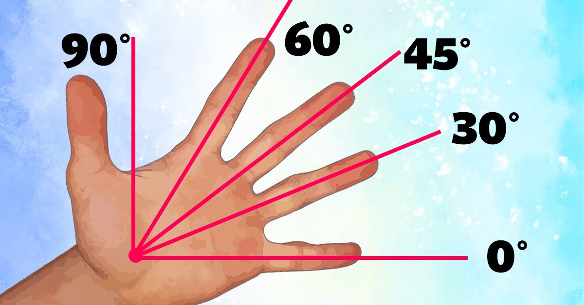 Ta prosta sztuczka pomoże Ci… Wyciągnij rękę, odwróć dłoń do góry i rozsuń palce jak najdalej od siebie.  Upewnij się, że kciuk jest prostopadły do ​​małego palca. Następnie, jeśli mały palec pokazuje 0 stopni: