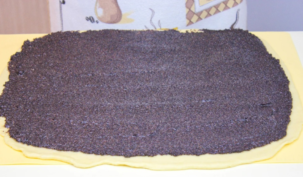 Stolnicę lub blat posypujemy cienką warstwą mąki. Wyrośnięte ciasto dzielimy na 4 równe części i każdą z nich rozwałkowujemy na kształt prostokąta o grubości 3 mm. Masę makową również dzielimy na 4 części i smarujemy nią płaty ciasta, pamiętając o tym, aby jeden z dłuższych końców nie smarować masą ok. 1,5 cm od końca, ponieważ przy zawijaniu mak będzie się przesuwał.