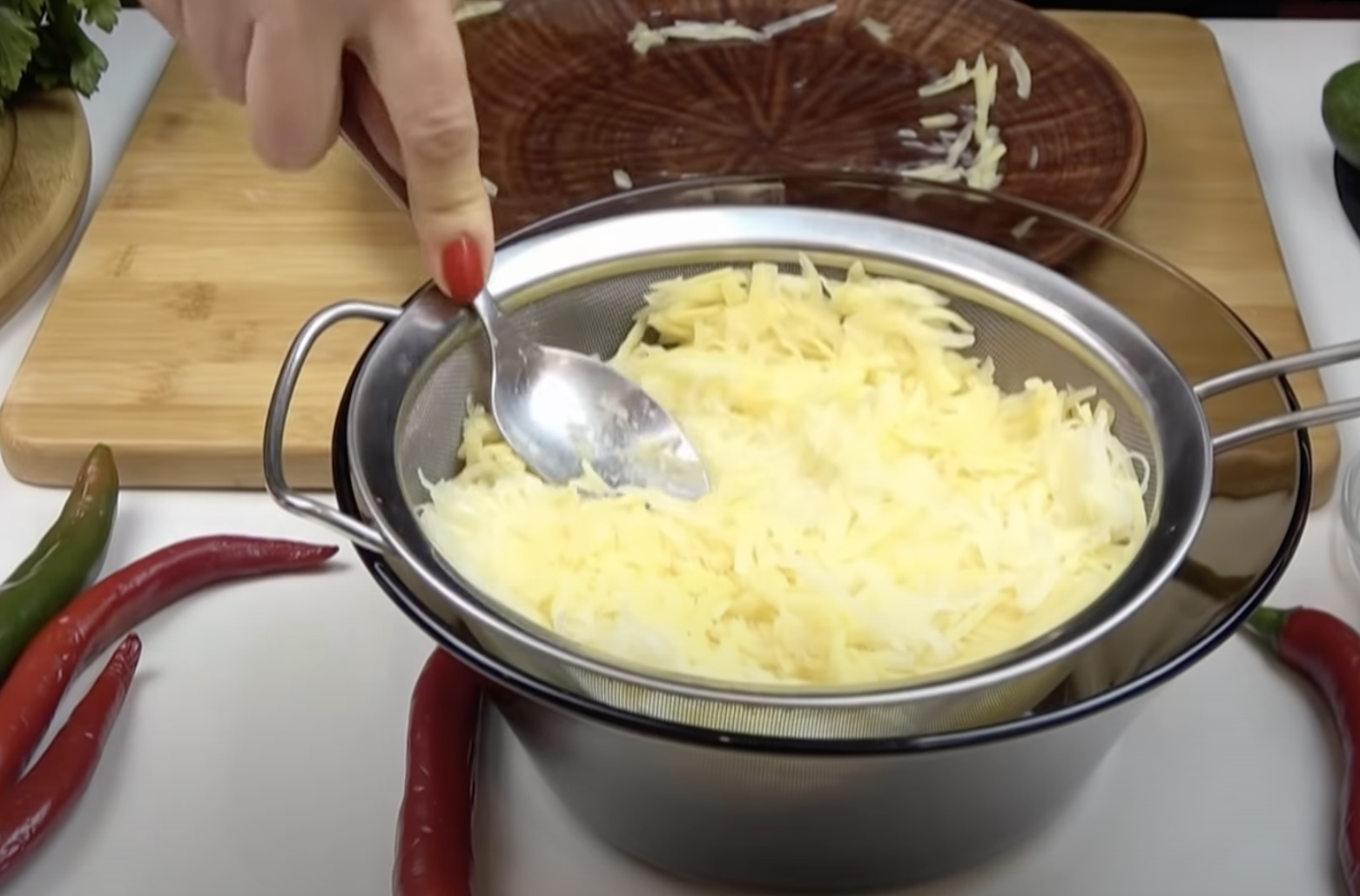 Ziemniaki zetrzyj na tarce, a następnie dokładnie odciśnij (dzięki temu placki będą bardziej zwarte i nie będą rozpadać się przy pieczeniu).