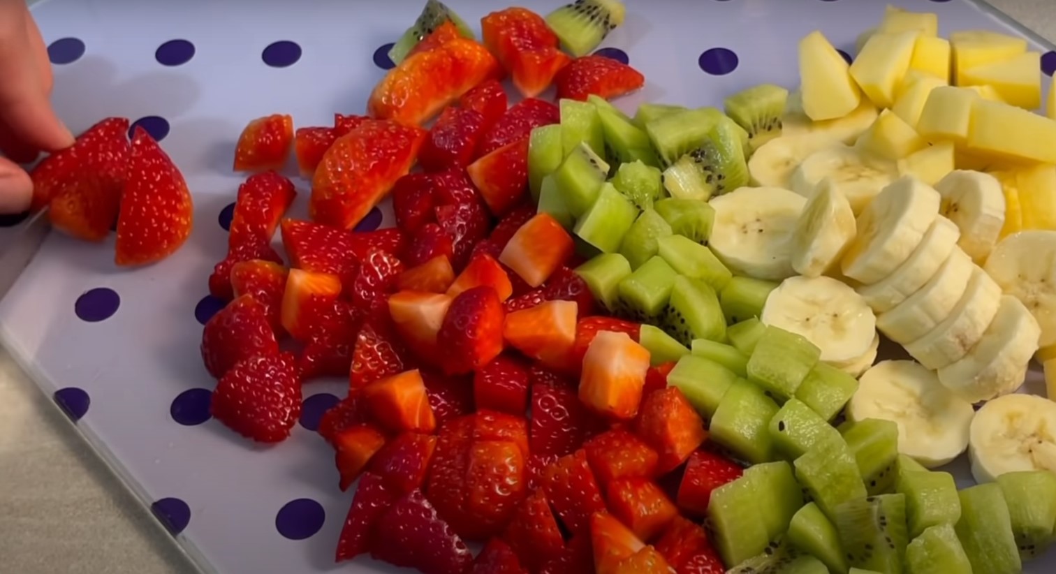 Wszystkie owoce w pierwszej kolejności należy dokładnie umyć, osuszyć, a następnie pokroić kolejno na małe kawałeczki bądź kostkę. Gdy owoce są już pokrojone należy polać je sokiem z wyciśniętej cytryny.