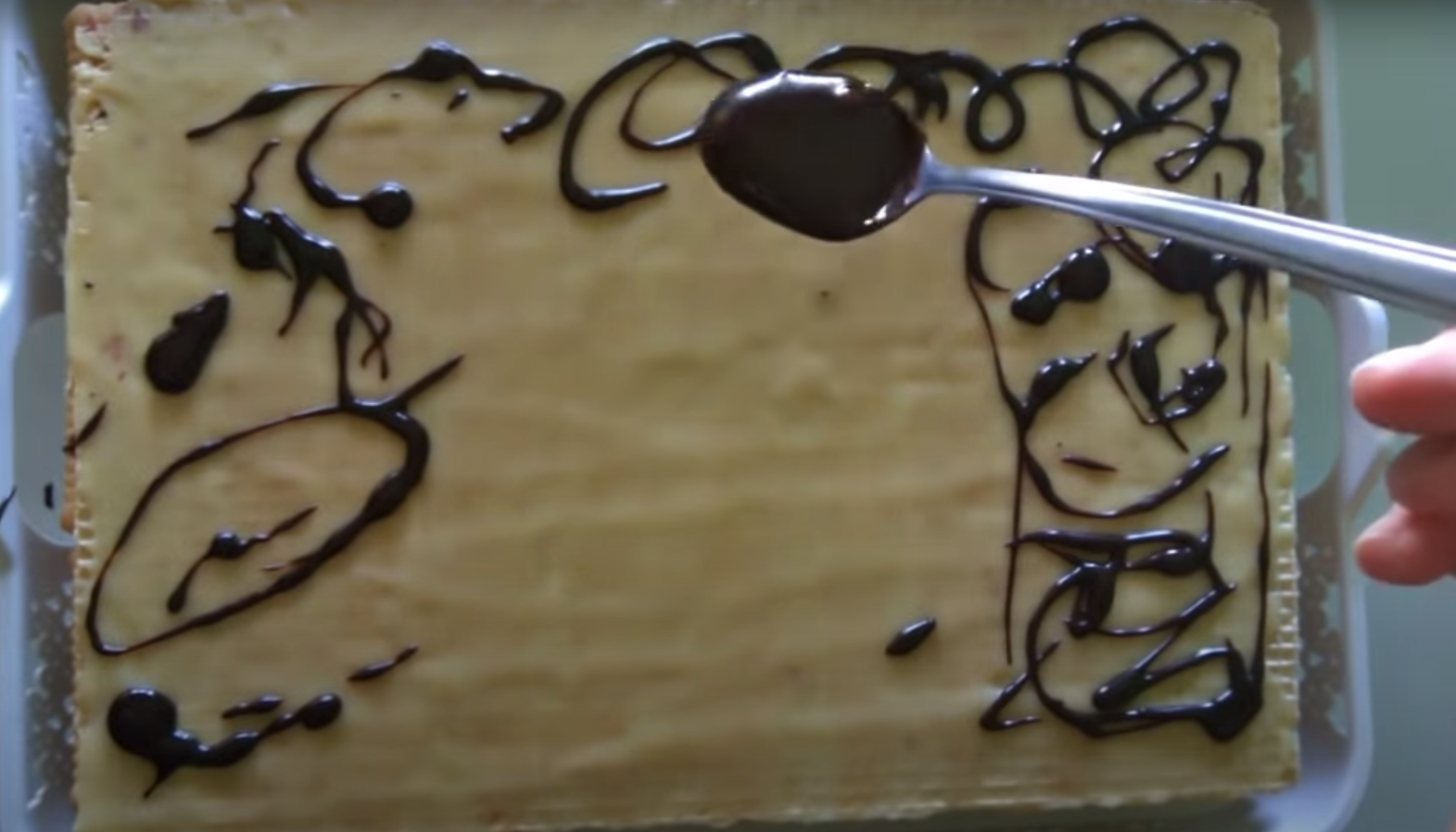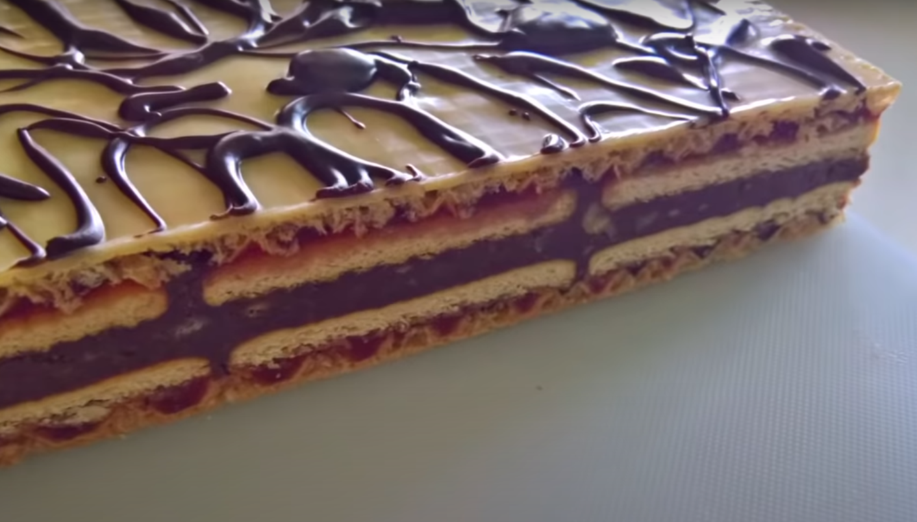 Taką gotową masę należy wyłożyć na warstwie herbatników rozłożonych na jednym waflu. Po ułożeniu masy należy ją zakryć kolejną porcją 17 sztuk herbatników i przykryć je drugim waflem obsmarowanym dżemem.