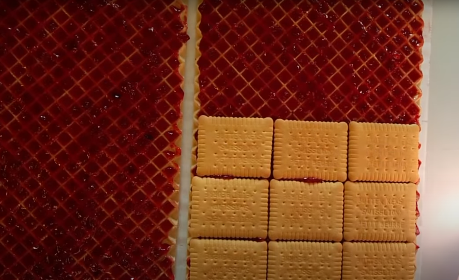 Na start potrzebujesz 2 duże wafle. Posmaruj je dżemem (potrzebujesz na to około 350 g) i na takie wafle połóż herbatniki (wyjdzie ich około 17 sztuk).