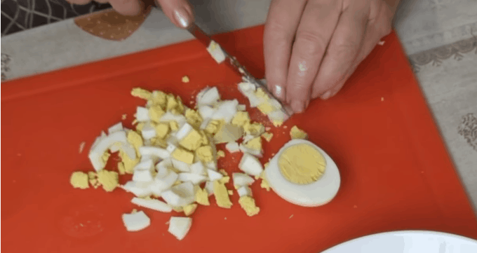 Ogórki kroimy w kółka. Marchewkę z groszkiem odcedzamy i wkładamy do miski wraz z odsączoną cebulą i ogórkiem. Później dodajemy pokrojony seler i doprawiamy solą i pieprzem. Na koniec kroimy jajka i mieszamy razem z resztą składników.