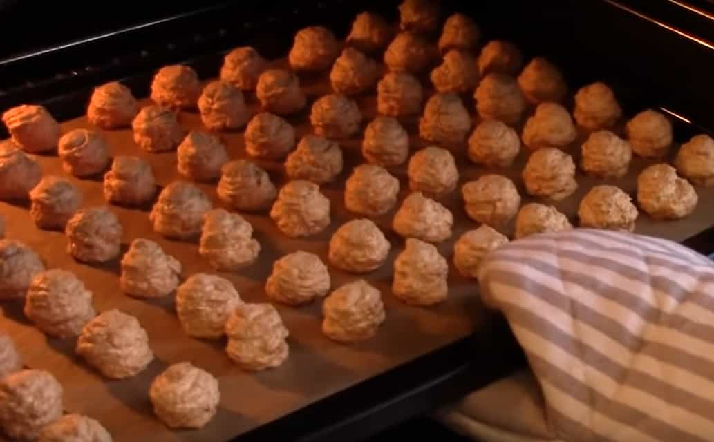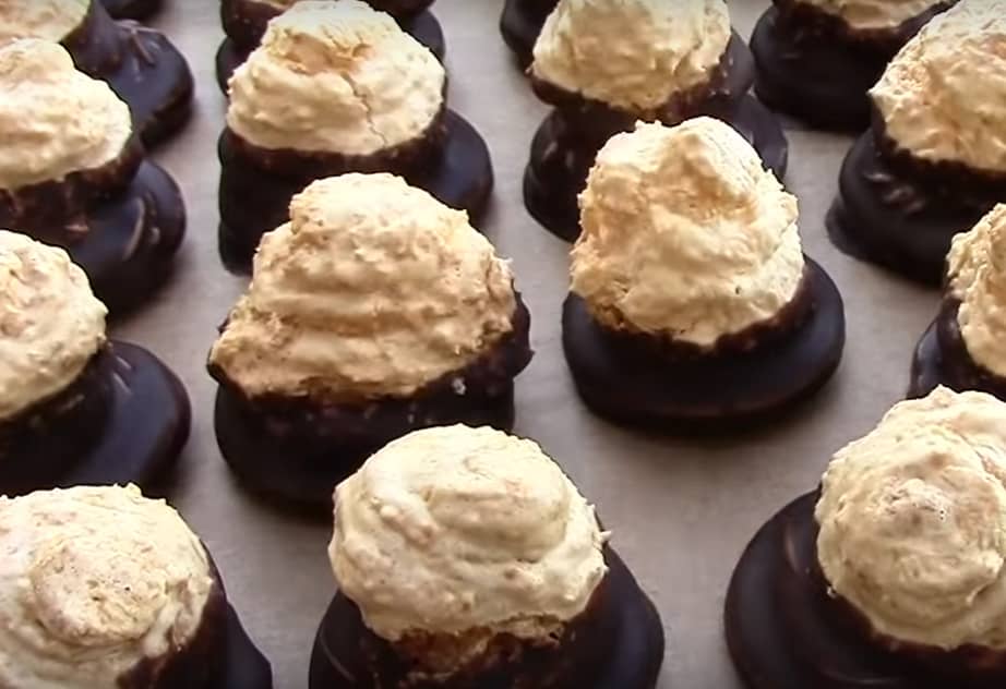 Masę przekładamy do rękawa cukierniczego z okrągłą końcówką i formujemy na blaszce wyłożonej papierem do pieczenia kupki o średnicy około 2 cm. Delikatnie naciśnij czubki orzechów kokosowych palcem zanurzonym w wodzie. Wstawić do piekarnika i piec w 140 stopniach do zarumienienia (około 30-40 minut).