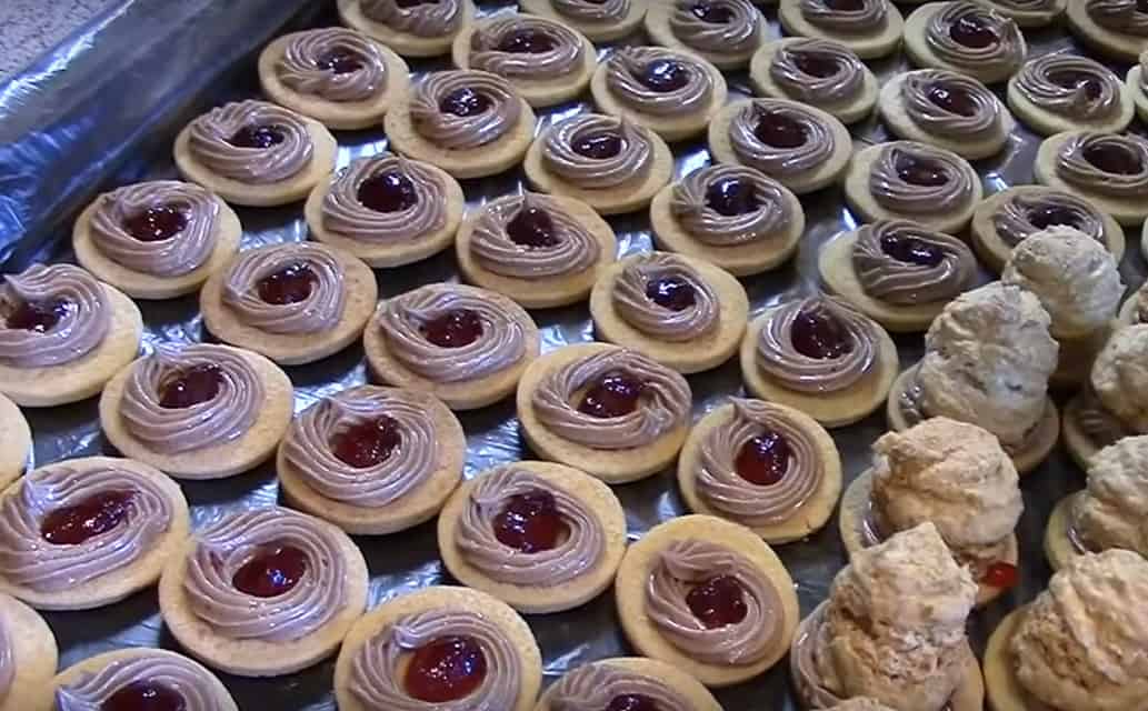 Ubij gładki krem czekoladowy. Ciastka ułożymy na blasze do pieczenia. Za pomocą ozdobnej torebki spryskujemy kremem każde koło w kształcie koła, abyśmy mogli nałożyć więcej dżemu na środek. Dodajemy trochę konfitury porzeczkowej i nakładamy główki kokosowe. Wstaw do lodówki na 30 minut, aby stwardniało.