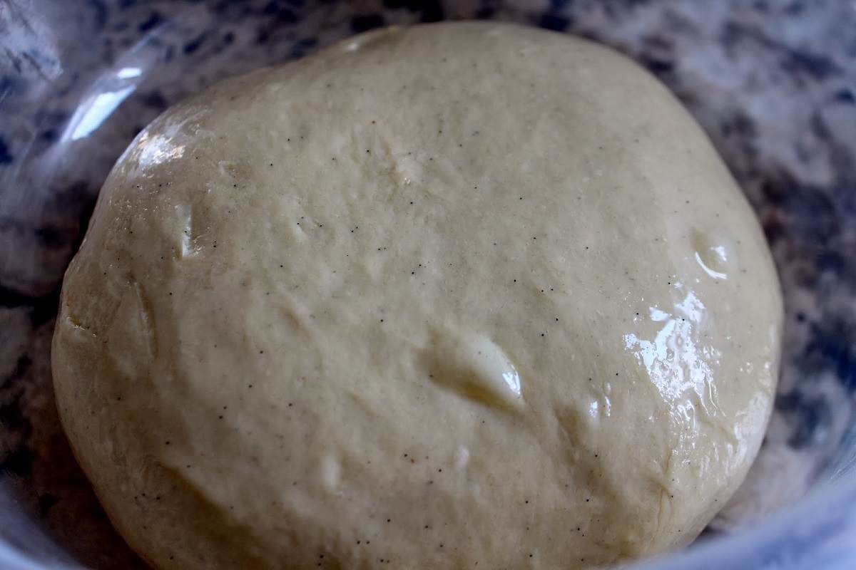 Dodaj do miski jeszcze 20 ml oleju i kontynuuj wyrabianie przez 10 minut. Ciasto powinno być na tyle miękkie i klejące, aby mogło się przykleić do stolnicy. Włóż ciasto w folię i umieść w misce. Pozostawić w ciepłym miejscu na 40 minut.