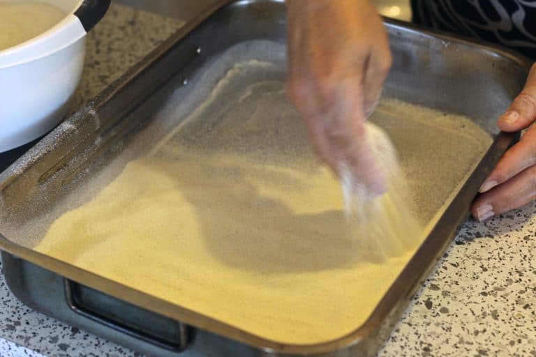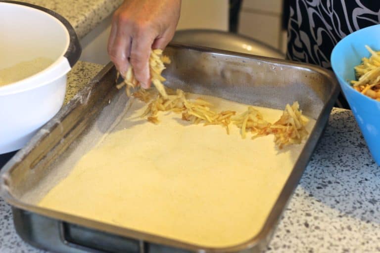 Następnie przygotuj blachę, smarując ją masłem i obsypując mąką. Na jej dnie rozłóż warstwę suchej mieszanki, pamiętając, by nie była ani zbyt gruba, ani zbyt cienka, aby dno blachy nie było widoczne.