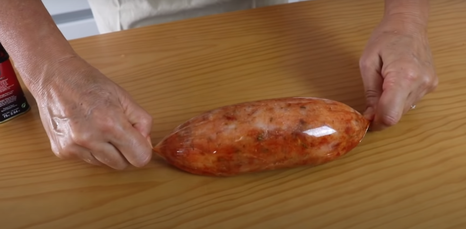 Na blacie kuchennym rozłóż folię spożywczą, posyp ją mieloną czerwoną papryką, a na niej ułóż przygotowaną masę mięsną. Uformuj z mięsa grubszą roladę, przypominającą cukierek. Przytrzymując końce, tocz roladę po blacie, by nadać jej ładny, okrągły kształt.